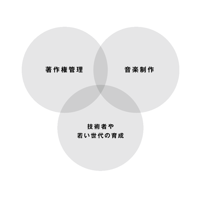 著作権管理、音楽制作、それに伴う技術者や若い世代の育成という、3つの柱を中心に、企画から制作、ライブパフォーマンスのプロデュースなど、多岐にわたる分野でクライアントの夢やビジョンを実現し、感動的なエンターテインメントを生み出していきます。